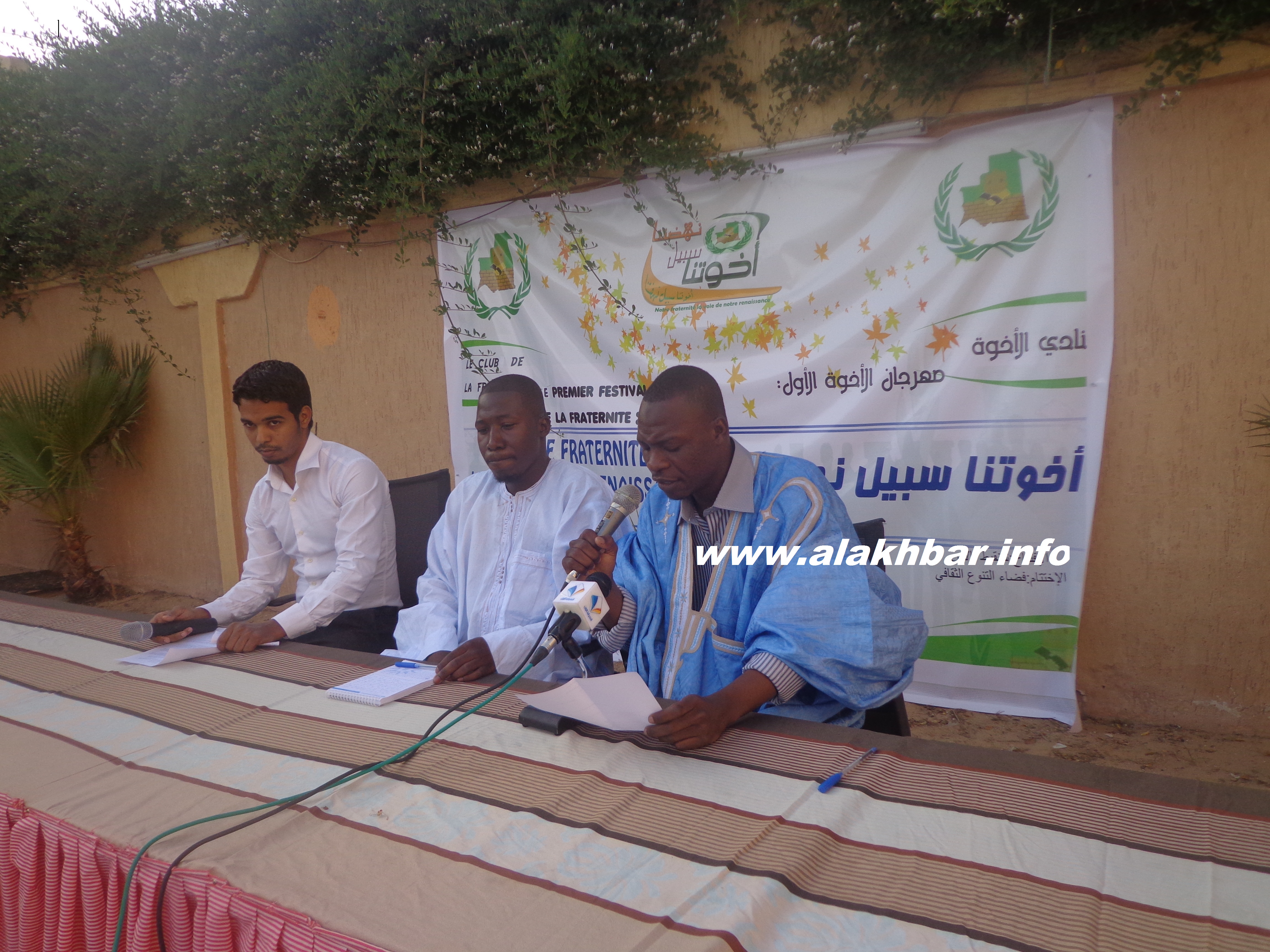 الأخبار (نواكشوط) - افتتح نادي الاخوة الثقافي التابع لجمعية شبيبة بناء الوطن اليوم السبت 13-04-2013 بفندق شنقيط ابلاس مهرجان الأخوة الأول الذي يستمر لمدة يومين تحت عنوان "أخوتنا سبيل نهضتنا" حضر حفل الافتتاح شخصيات دوعوية وثقافية عديدة.