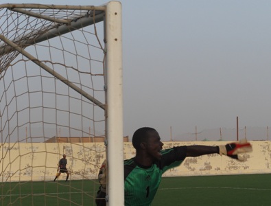حارس مرمى فريق الرياض بذل كل جهده لحماية مرماه، لكن إصرار مهاجمي فريق الشرطة بدد تلك الجهود (الأخبار)