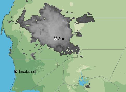 وحسب صور الاقمار الاصطناعية فقد وصلت السحب أقصى شرق آدرار مساء أمس فى حدود الثامنة وبقيت تزحف غربا طيلة مساء أمس وحتى صباح اليوم وقد خفت كثافتها بعد الساعة الثامنة من صبا ح اليوم، ويتوقع أن تكون المنطقة الممتدة من شمال مدينة أطار وحتى ما يناهز 150 كلم داخل ولاية تيرس زمور شمالا قد شهدت فجر اليوم أمطارا كثيفة بإذن الله، فيما يتوقع أن تكون المنطقة الممتدة من أقصى شمال تكانت حتى أقصى شرق آدرار قد شهدت أمطارا متوسطة إلى كثيفة ما بين الثامنة من مساء أمس وحتى الثالثة من فجر اليوم بإذن الله تعالى.