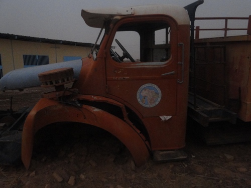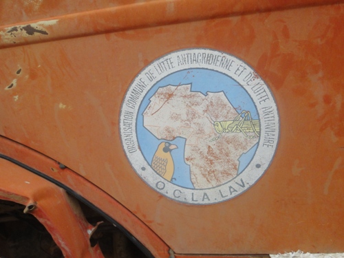 إحدى المركبات المتعطلة في القاعدة ويبدو بوضوح شعار منظمة OCLALAV التي كانت مسؤولة عن محاربة الجراد في المنطقة وخلفت نفايات في مناطق من غرب إفريقيا من بينها "لتفتار" وسط موريتانيا (الأخبار)