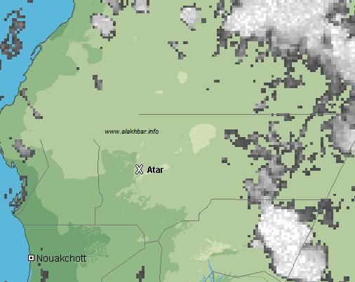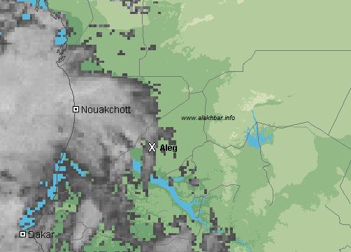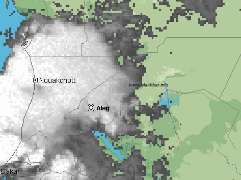 وحسب صور الأقمار الاصطناعية الملتقطة حتى تمام الساعة الحادية عشر من مساء اليوم فإن سحبا كثيفة قادمة من الجنوب تتواجد الآن على جل لعصابة والحوض الغربي، كامل غيدى ماغة وغورغل، النصف الشرقي من تكانت، وتتجه هذه السحب نحو الشمال الغربي ويتوقع أن تعم كامل لبراكنة وغرب تكانت وشرق ترارزة وربما حتى جنوب آدرار وكامل جنوب ترارزة قبل الرابعة من فجر غد بإذن الله تعالى، كما يتوقع أن تؤدي إلى أمطار غزيرة بإذن الله تعالى، خاصة على شرق تكانت، كامل غيدى ماغة، غورغل وغرب لعصابة.