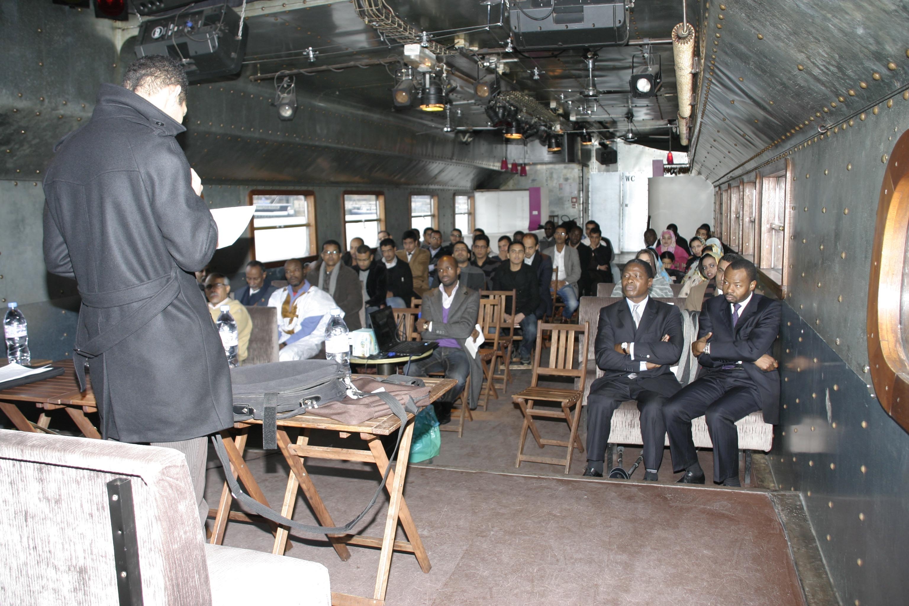 الطلاب الموريتانيون بفرنسا وهم يخلدون خمسينية الاستقلال على متن السفينة، ورئيس جمعيتهم خالد ولد محمدن يلقي كلمة بالمناسبة