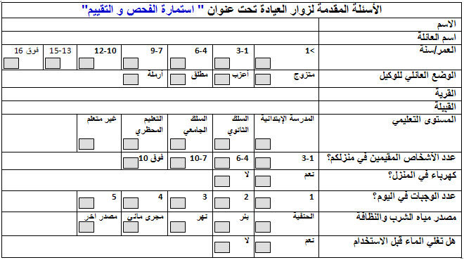 2- الطبيعة الإحصائية للاستمارات التي ملئت من طرف كل من تمت معاينتهم حيث تضمنت الاستمارات خانات كثيرة لا علاقة لها بالتشخيص الطبي بل هي بشكل واضح دارسة موسعة للسكان تشمل القبائل ونسبة الطلاق والأوضاع الاقتصادية والمستوى التعليمي ومعدل أفراد الأسرة , وقد جاءت الإستمارة على النحو التالي :