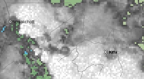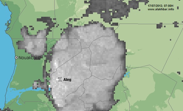 منذ الساعة الواحدة من فجر الأربعاء 17 يوليو الجاري تتواجد بعض العواصف الرعدية المحملة بالامطار المتوسطة إلى الكثيفة جدا على جل المنطقة الممتدة من النصف الجنوبي من الحوض الشرقي وحتى اترارزة غربا ويتوقع أن تؤدي إلى تهاطل الأمطار المتوسطة إلى الغزيرة جدا طيلة هذا اليوم بإذن الله تعالى.
