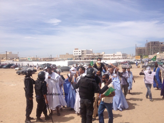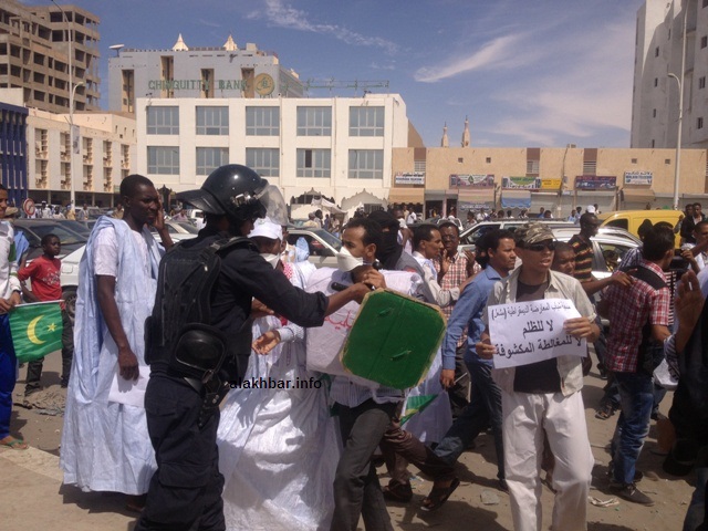 عدد من الشباب الموريتاني تجمهروا على الرصيف المقابل لساحة "ابلوكات" فيما رابط أفراد من الشرطة على جنبات الساحة لمنع الشباب من دخلوها قبل أن يقرر منظمو التظاهرة استخدام "لابسي الدروع الورقية" لاقتحام ساحة ابلوكات.