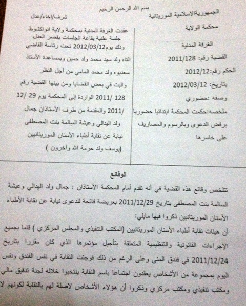واجهة الحكم الصادر عن الغرفة المدنية بمحكمة نواكشوط، والمؤكدة من محكمة الاستئناف بحكم صادر الشهر الحالي (الأخبار)