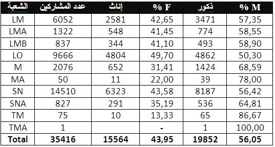 وتمثل نسبة البنات 43.95% من اجمالى المترشحين ويمثل مترشحوا التعليم العمومى نسبة 29.88% فى حين وصلت نسبة مترشحى التعليم الخاص 38.98، أما المترشحون الأحرار فنسبتهم 31.15%.