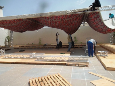 يسابق العمال الزمن من أجل إعداد منصة اللقاء التلفزيزني الذى يشكل أولى إطلالات مسؤولى المنطقة (تصوير الأخبار)