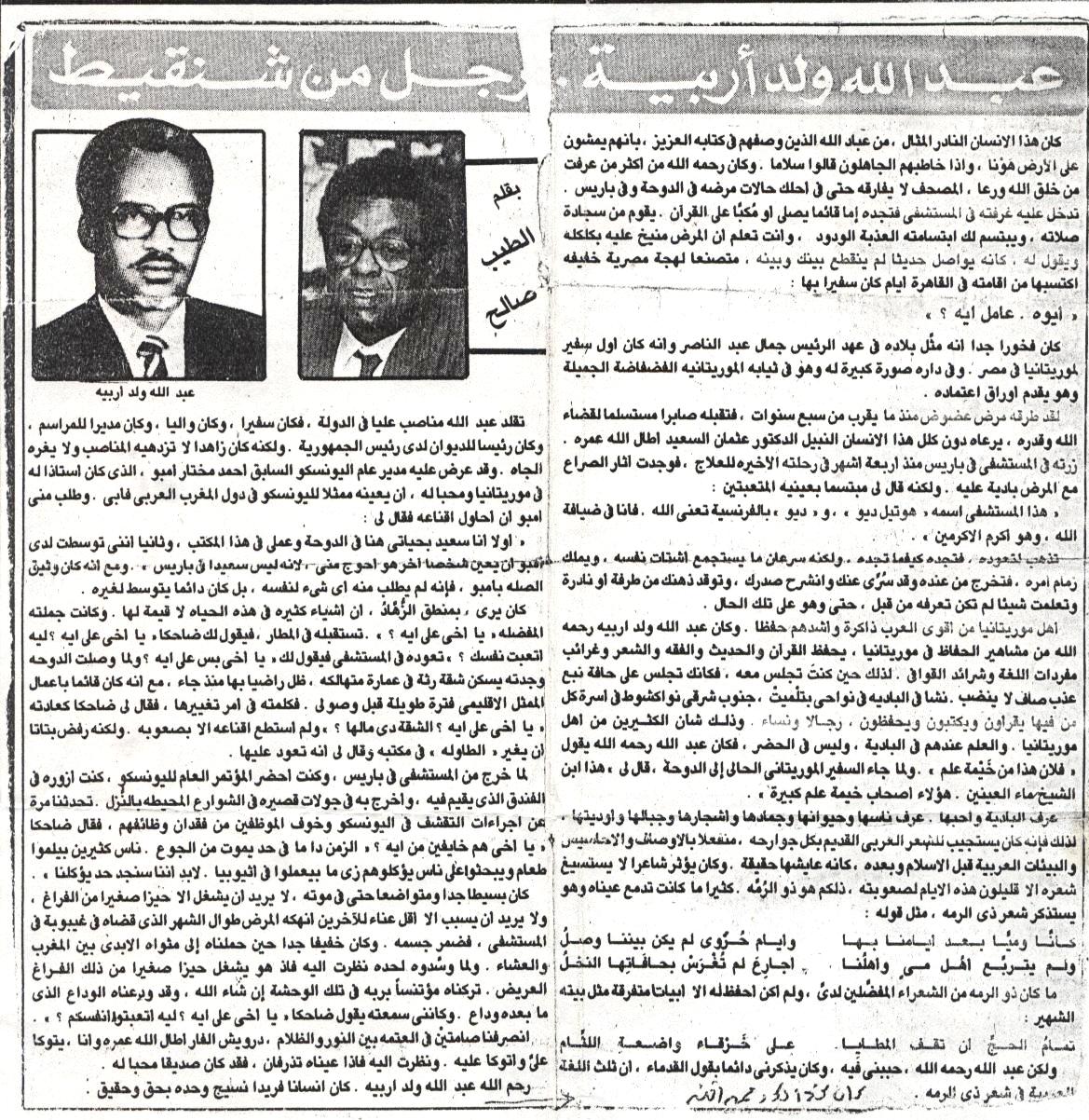 صورة المقال الذي كتبه الطيب صالح بعد رحيل عبد الله ولد أربيه والذي نشر في جريدة الراية القطرية و معه صورة للراحلين الصديقين.