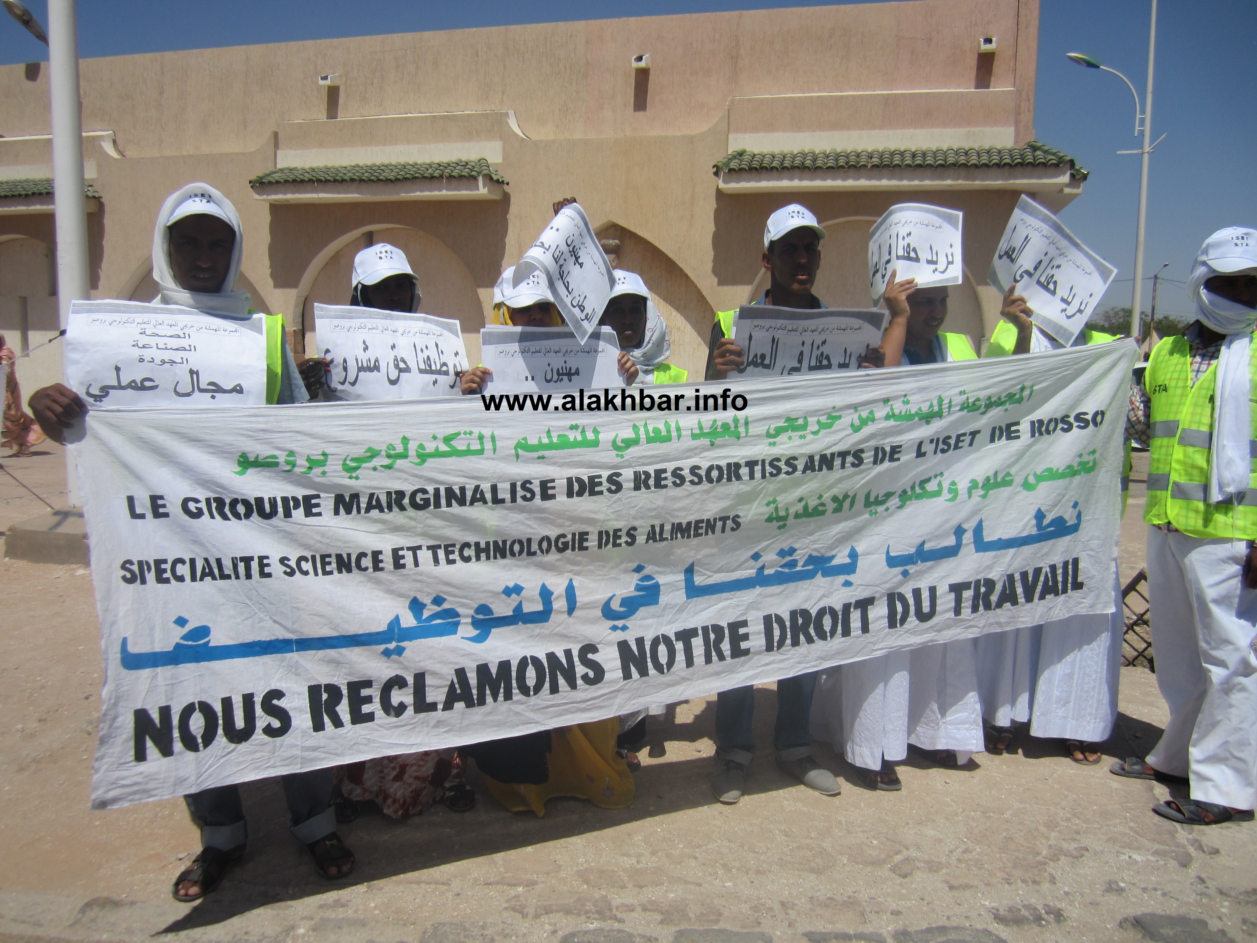 الأخبار (نواكشوط) - تظاهر اليوم الخميس 02 - 05 - 2013 خريجو المعهد العالي والتكنولوجيا بروصو أمام القصر الرئاسي، وذلك للمطالبة بتوظيفهم مثل زملائهم الذين تم اكتتابهم في عدة وزارات وشركات.