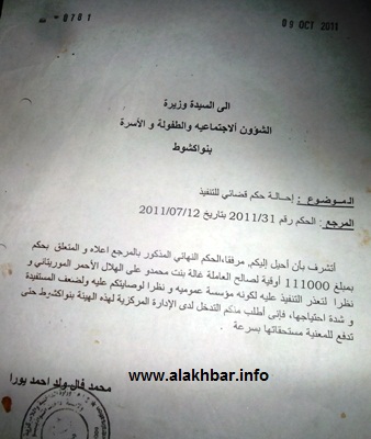 الأخبار(نواذيبو) – "عملت فى مركز إيواء المهاجرين 7 سنوات حيث كنت أتولى تنظيف قاعاتهم السبعة , ورق لى المشرف على المركز حيث خفف عنى العمل بزميلة لى لتخفيف الأعباء علي , لكننى فوجئت بفصلى بشكل تعسفى من قبل رئيس الهلال الأحمر"