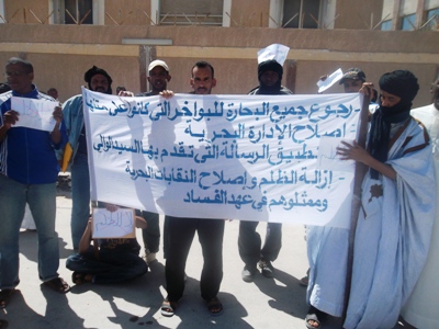 الأخبار/ (نواذيبو) - نظم العديد من البحارة المسرحين في العاصمة الاقتصادية نواذيبو زوال الأحد 24 فبراير 2013، أمام مبنى الولاية وقفة احتجاجية للمطالبة بتشغيلهم بعد عدة أشهر من التسكع والاكتواء بنار البطالة، حسب تعبيرهم .