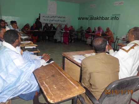 الأخبار(ازويرات)/ نظم قسم النقابة الوطنية للمعلمين صباح اليوم السبت الموافق 19/01/2013 دورة تكوينية لصالح 50 معلما في ازويرات في مبنى مدرسة الواحات وبالتعاون مع الإدارة الجهوية للتهذيب والتكوين المهني في الولاية ,