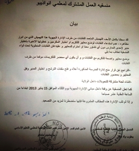 الأخبار(نواذيبو) - انتقدت منسقية العمل المشترك لمعلمى العاصمة الاقتصادية ما وصفته ب "التهميش المتعمد للنقابات من قبل الإدارة الجهوية للتعليم على مستوى المدينة حسب قولها .