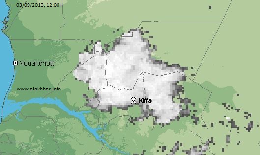 الأخبار (نواكشوط)- تهاطلت أمطار غزيرة على مناطق واسعة من ولاية تكانت ولعصابه اليوم الثلاثاء 3-9-2013، وسط توقعات بتهاطل مزيد من السحب على مناطق أخرى في لبراكنة، آدرار وإينشيري ونواذيبو وترارزة ونواكشوط خلال الساعات القادمة