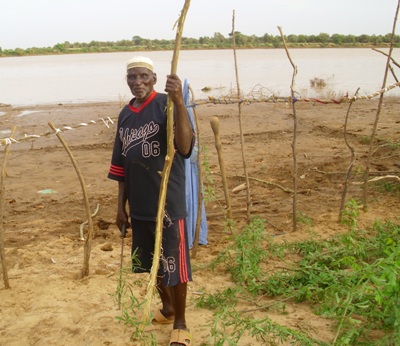 يقف الستيني إسماعيلا جوب في أرضه على ضفة النهر وهو يسابق غروب الشمس حتى يتمكن من تشذيب أغصان الشجر التي سيستخدمها في تسوير الأرض التي انجلى عنها النهر أخيرا.