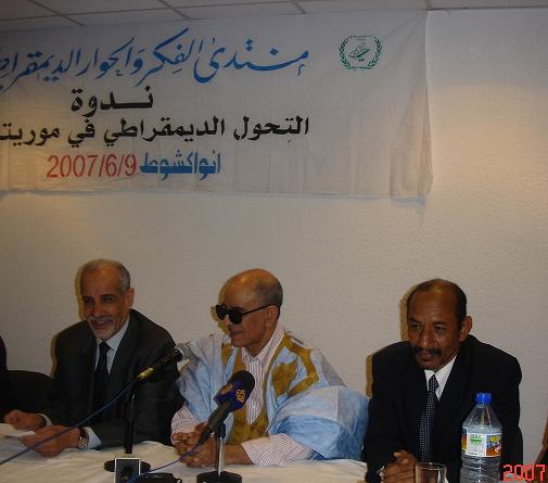 الأستاذ أحمد ولد الوافي في ندوة لمنتدى الفكر والحوار حول التحول الديمقراطي في اليسار ومحمد يحظيه ولد أبريد الليل في الوسط ومدير نشر جريدة النهار على اليمين(تصوير وكالة الأخبار)