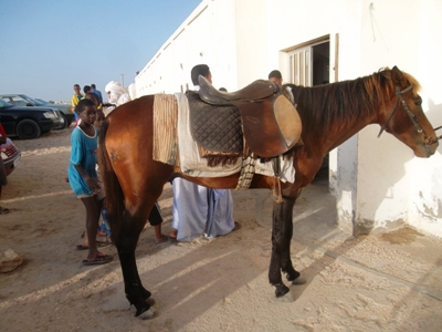 صاحب الحصان اصطحب أحد الأطفال وأردفه على الحصان ليجري به جولة وسط استغراب الحاضرين من وسيلة النقل الجديدة فى العاصمة الإقتصادية .