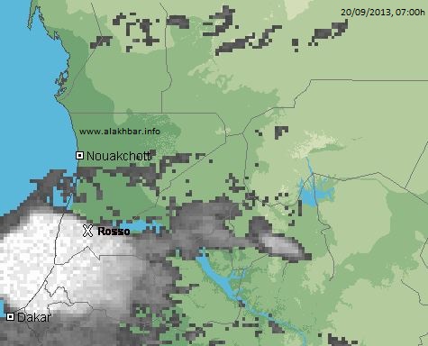 أما صباح اليوم الجمعة 20 سبتمبر الجاري فقد وصلت سحب جديدة قادمة من الجارة السينغال جنوب ولاية ترارزة ابتداء من الساعة الخامسة من فجر اليوم ومن المتوقع أن تؤدي إلى تهاطل بعض الامطار المتوسطة إلى الكثيفة على المنطقة الممتدة من العاصمة السينغالية داكار وحتى العاصمة نواكشوط شمالا، ومن جنوب لبراكنة وحتى ما يقارب 100 ميل داخل المحيط الأطلسي غربا طيلة صباح اليوم بإذن الله تعالى.